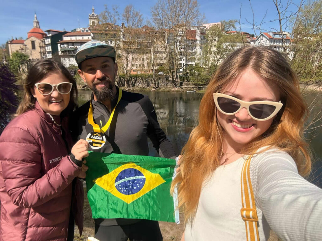 Próximo da chegada, margeando o rio Tâmega, preparando a bandeira do Brasil.